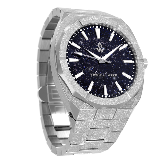 Dieses Zifferblatt aus echtem Aventurin gleicht einer kosmischen Explosion: Es funkelt wie Sternenstaub und vermittelt das Gefühl, den Nachthimmel am Handgelenk zu tragen.