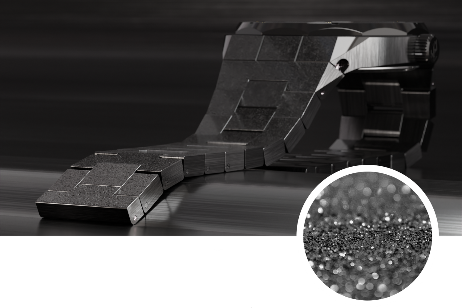 Die Oberfläche der Astronauta "Black Limited" ist mit dem sogenannten "Florentiner Finish" veredelt. Dabei werden Gehäuse sowie Armband mit einem diamantbestücktem Gravurwerkzeug "geschlagen". Diese jahrhundertealte Handwerkskunst verleiht dieser Uhr ihr sagenhaftes und phänomenales Schimmern.