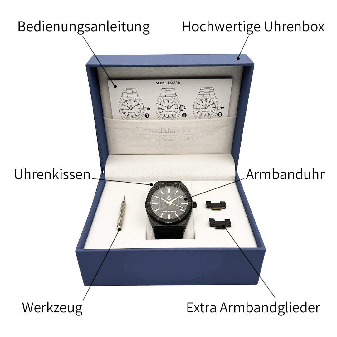 Selbst in völliger Dunkelheit kannst du die Uhrzeit problemlos ablesen, denn die Zeiger und Indizes der Kristall Werk Uhren sind lumineszierend.