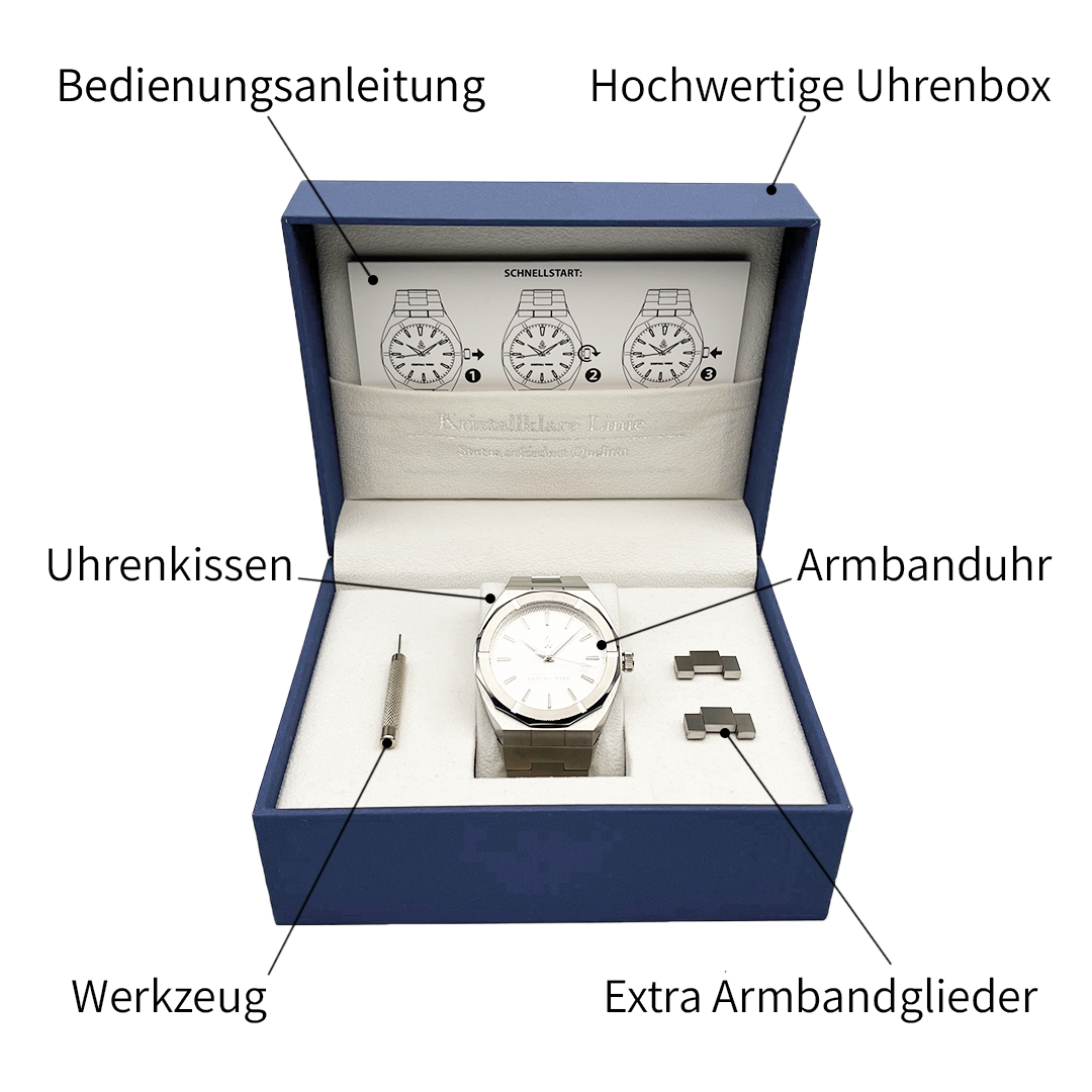 Kristall Werk-Uhren werden aus besonders hartem 316L-Edelstahl gefertigt. Dieser Stahl wird sowohl von der Marine als auch von Chirurgen verwendet und geschätzt. Von der Marine – weil es sehr robust und korrosionsbeständig ist. Von Chirurgen – weil es hypoallergen und daher sicher für Allergiker ist.